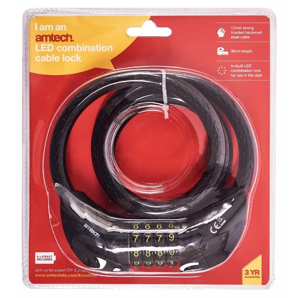 4 digit combination lock Bright LED for use in dark conditions Approx size: 12mm diameter x 900mm length Ideal for securing bicycles and other security applications Replacement battery type 2 x Lithium CR927 3V.