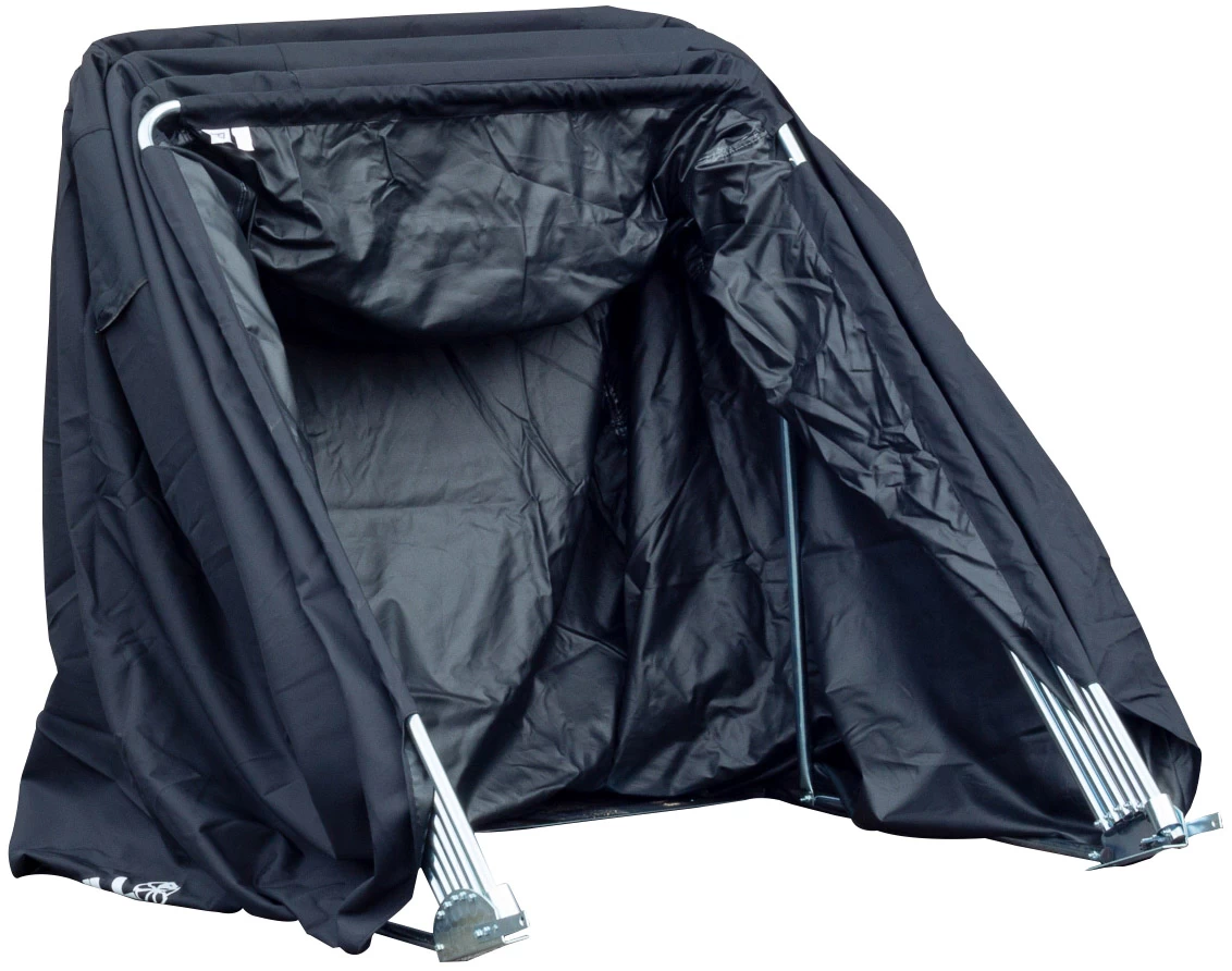 Sturdy metal frame fitted 600D waterproof cover housing, folds open and closed for easy access. Allows motorcycles to be stored freely without material contact.