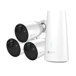 Introducing the NextGen Battery Camera Kit from EZVIZ – EZVIZ BC1 Battery Camera Triple Kit with Base Station kit includes 3x BC1 Cameras and 1x Base station. The EZVIZ BC1 is a weatherproof indoor/outdoor standalone 100% wire-free, battery-powered security camera with 128 Degrees viewing angle. Equipped with an impressive 12,900mAh rechargeable battery, the BC1 Battery Camera can last for up to a year on one full battery charge, offering you up to 365-days peace of mind with pairing to the base station included. Up to 6 BC1 cameras can be connected to the base station at one time.