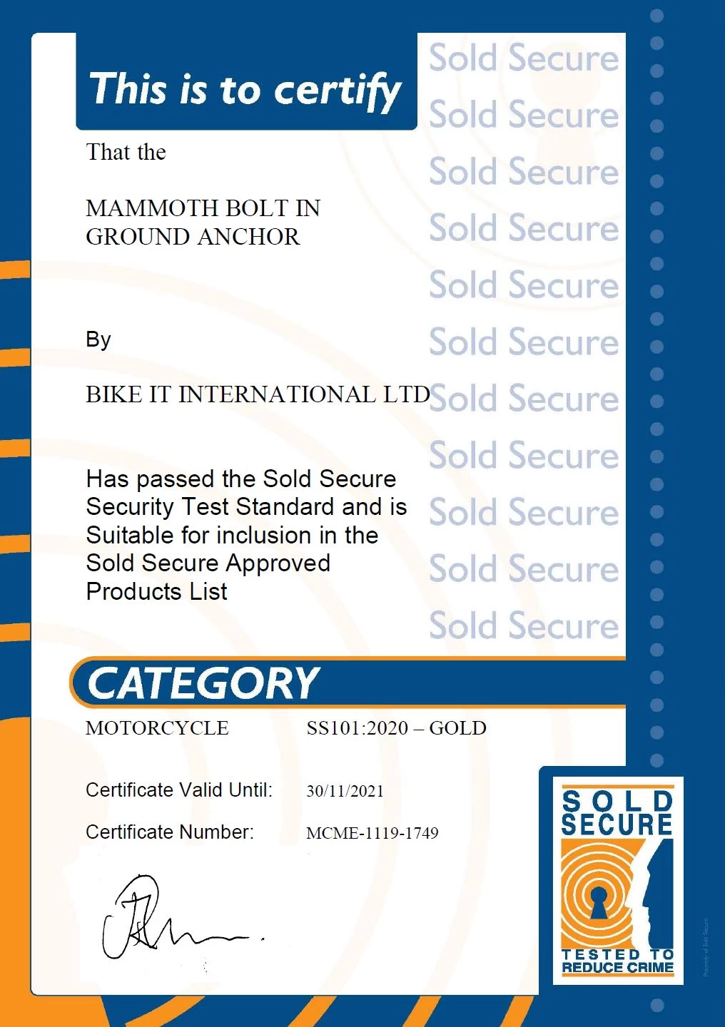 This Mammoth product has passed the Sold Secure Test Standard in categories Motorcycle Gold and Motor Scooter Gold and is included in the Sold Secure Approved Products List. Sold Secure products are evaluated using methods approved by the Police and Home Office, use of this product can reduce insurance premiums with participating insurers.