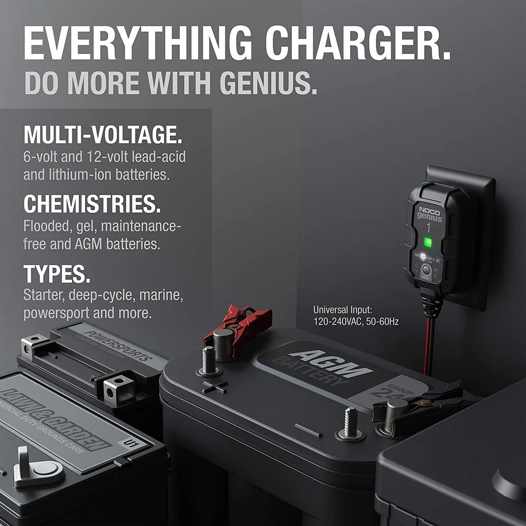 The NOCO 1A Battery Charger (GENIUS1UK) is a one powerful, 1-Amp battery charger. It is one of Noco’s highest-performing, energy-efficient, and compact chargers available. It acts as a 6-volt and 12-volt battery charger but is also a battery maintainer and battery desulfator, rated at 1-amp for lead-acid automotive, marine, and deep-cycle batteries, including flooded, gel, AGM, and maintenance-free, plus lithium-ion batteries.
