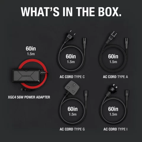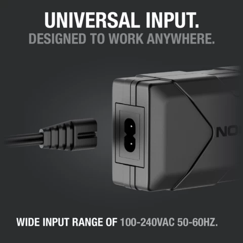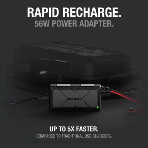 - A 56-watt power adapter for rapidly recharging NOCO Boost & NOCO Boost Max UltraSafe Lithium Jump Starters.