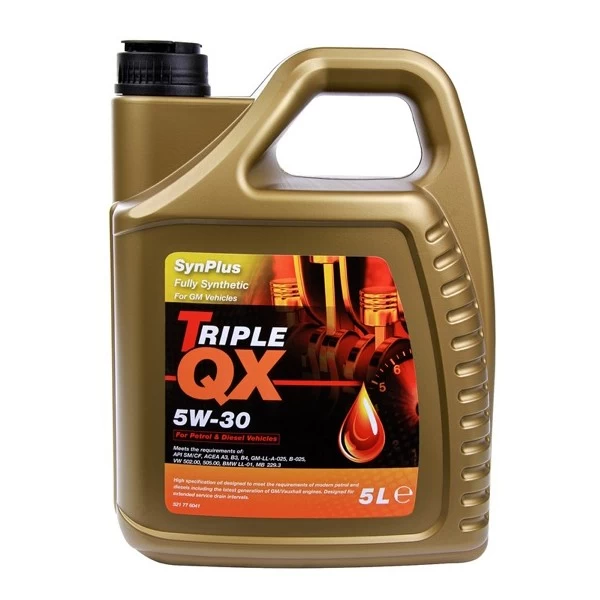 Triple QX SynPlus GM 5W-30 fully synthetic motor oil is blended in UK with the highest quality base stocks and advance additive technology. It meets the performance levels and specifications for the vehicles requiring this oil. Triple QX motor oil provides optimum engine performance, improved fuel economy and reduced exhaust emissions.