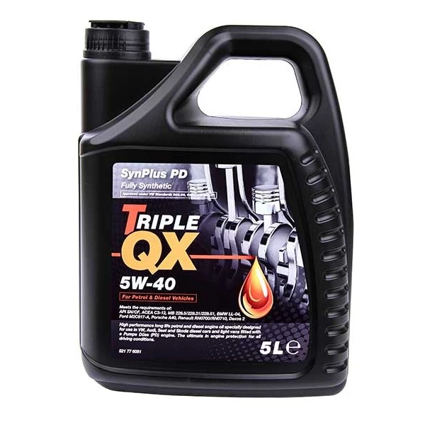 Triple QX SynPlus PD 5W-40 fully synthetic motor oil is blended in UK with the highest quality base stocks and advance additive technology. It meets the performance levels and specifications for the vehicles requiring this oil. Triple QX motor oil provides optimum engine performance, improved fuel economy and reduced exhaust emissions.