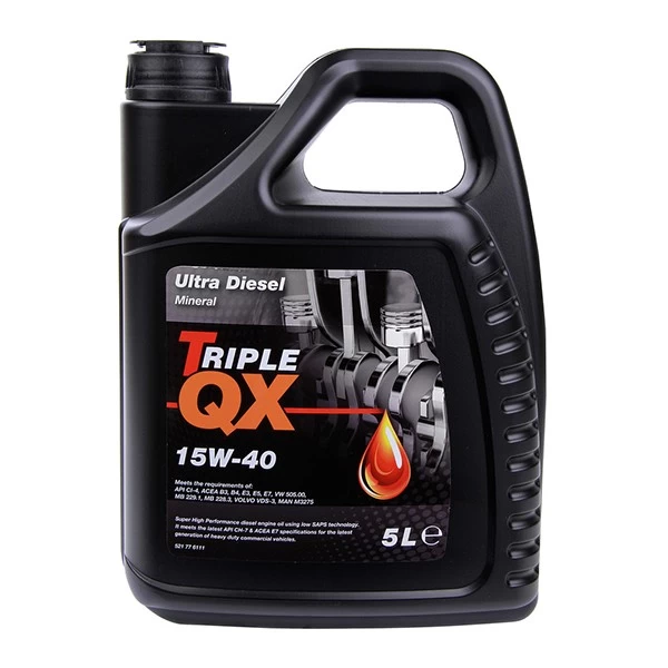 Triple QX Ultra Diesel 15W-40 mineral motor oil is blended in UK with the highest quality base stocks and advance additive technology. It meets the performance levels and specifications for the vehicles requiring this oil. Triple QX motor oil provides optimum engine performance, improved fuel economy and reduced exhaust emissions.